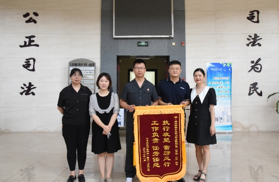 ? ? ? ? 8月8日,鎮(zhèn)江公司向鎮(zhèn)江新區(qū)法院執(zhí)行局陳萍萍及王欣法官送上印有“執(zhí)行攻堅 雷厲風(fēng)行 工作負(fù)責(zé) 任勞任怨”字樣的錦旗,感謝兩位法官在協(xié)助鎮(zhèn)江公司執(zhí)行回款中的辛勤付出。