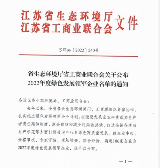 ? ? ? ?近日,經(jīng)江蘇省生態(tài)環(huán)境廳、全省各級生態(tài)環(huán)境部門、工商聯(lián)組織聯(lián)合評審,鎮(zhèn)江公司榮獲2022年“江蘇省綠色發(fā)展領(lǐng)軍企業(yè)”稱號。此次獲獎是對鎮(zhèn)江公司深入踐行習(xí)近平生態(tài)文明思想,將減污降碳源頭治理融入企業(yè)發(fā)展戰(zhàn)略,積極參與碳達(dá)峰碳中和計(jì)劃,強(qiáng)化減污降碳協(xié)同增效的充分認(rèn)可。