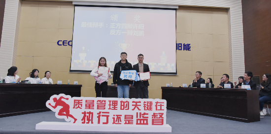 ? ? ? ?從對方開篇立論到攻辯環(huán)節(jié)再到盤問、自由辯論環(huán)節(jié),都妙語連珠、金句頻出。雙方陳詞精辟犀利、滴水不漏,博得現(xiàn)場觀眾的陣陣掌聲,將比賽推向了一個又一個高潮。在總結(jié)陳詞環(huán)節(jié)中,雙方四辯針對對手邏輯上的漏洞逐一回?fù)?,思慮清晰。經(jīng)過現(xiàn)場評委及觀眾評定,最終由正方代表隊(duì)“群英薈萃隊(duì)”獲得本場辯論的勝利。電池中心質(zhì)量部許陽和組件中心技術(shù)部劉鵬獲得“最佳辯手”稱號。