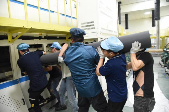一整張硅膠板,需要6-8名小伙子用盡全力才能抬起。在有限的空間內(nèi),他們演繹著力量與協(xié)調(diào)的舞蹈,將硅膠板精準(zhǔn)地送入層壓機。盡管汗水濕透了衣衫,盡管環(huán)境艱苦,但他們的眼神中卻沒有任何怨言和退縮。他們?nèi)褙炞⒌赝度氲焦ぷ髦?,用實際行動詮釋著勞動者的堅韌與毅力。