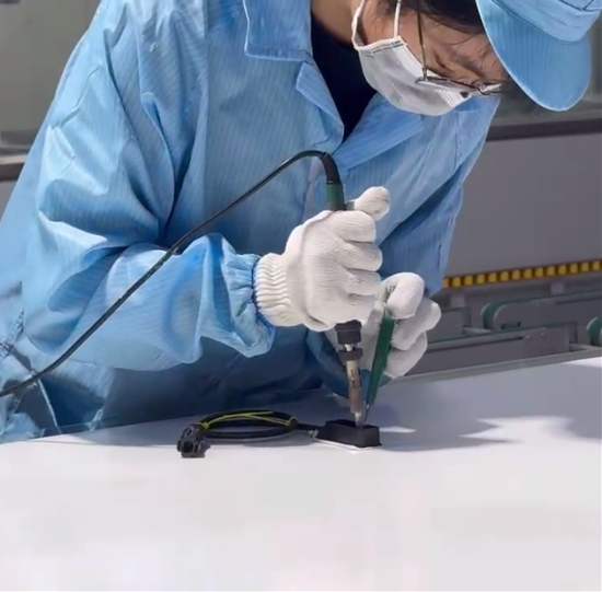 這是一雙被笨重手套藏起來的秀氣的手,這也是一雙在鎮(zhèn)江公司光伏組件生產(chǎn)過程中至關(guān)重要的手,這雙手柔軟卻堅毅,這雙手把接線盒和匯流條焊接在一起,連接太陽能組件產(chǎn)生的電力與外部線路,確保每一瓦電力都能安全、高效地傳遞,牢固地守護著光伏組件電力輸送的重要一關(guān)。