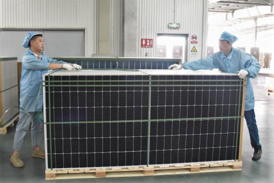 這里是組件出廠的最后一關(guān),這里是與“山”搏斗的地方,光伏組件成品疊成“巨石”、堆成“大山”。他們卻視“巨石”如珍寶,為“巨石”罩上最后一層防護,確保組件在運輸過程中不受外部環(huán)境的影響。他們撫摸著每一塊組件,希望每一塊組件都平安抵達(dá),發(fā)揮它們的作用,為世界帶來綠色電力。