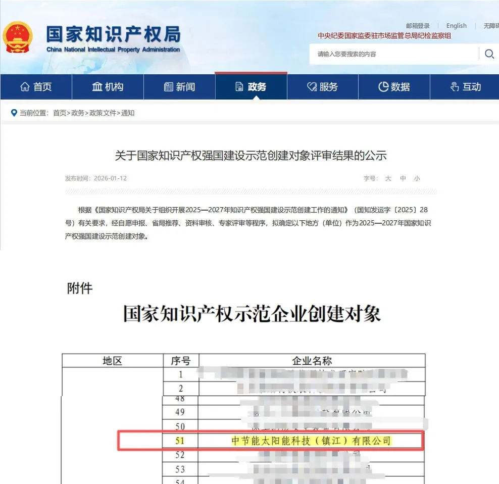 近日,國家知識(shí)產(chǎn)權(quán)局正式公示2025-2027年國家知識(shí)產(chǎn)權(quán)強(qiáng)國建設(shè)示范創(chuàng)建對(duì)象名單,鎮(zhèn)江公司憑借在知識(shí)產(chǎn)權(quán)創(chuàng)造、運(yùn)用、保護(hù)、管理全鏈條的綜合實(shí)力成功入選,進(jìn)入為期三年的高標(biāo)準(zhǔn)培育階段。這既是對(duì)企業(yè)十余年深耕光伏產(chǎn)業(yè)、堅(jiān)持科技立企與知識(shí)產(chǎn)權(quán)戰(zhàn)略深度融合的充分肯定,也標(biāo)志著其在引領(lǐng)光伏行業(yè)高質(zhì)量發(fā)展、邁向知識(shí)產(chǎn)權(quán)強(qiáng)企的道路上邁出重要一步。