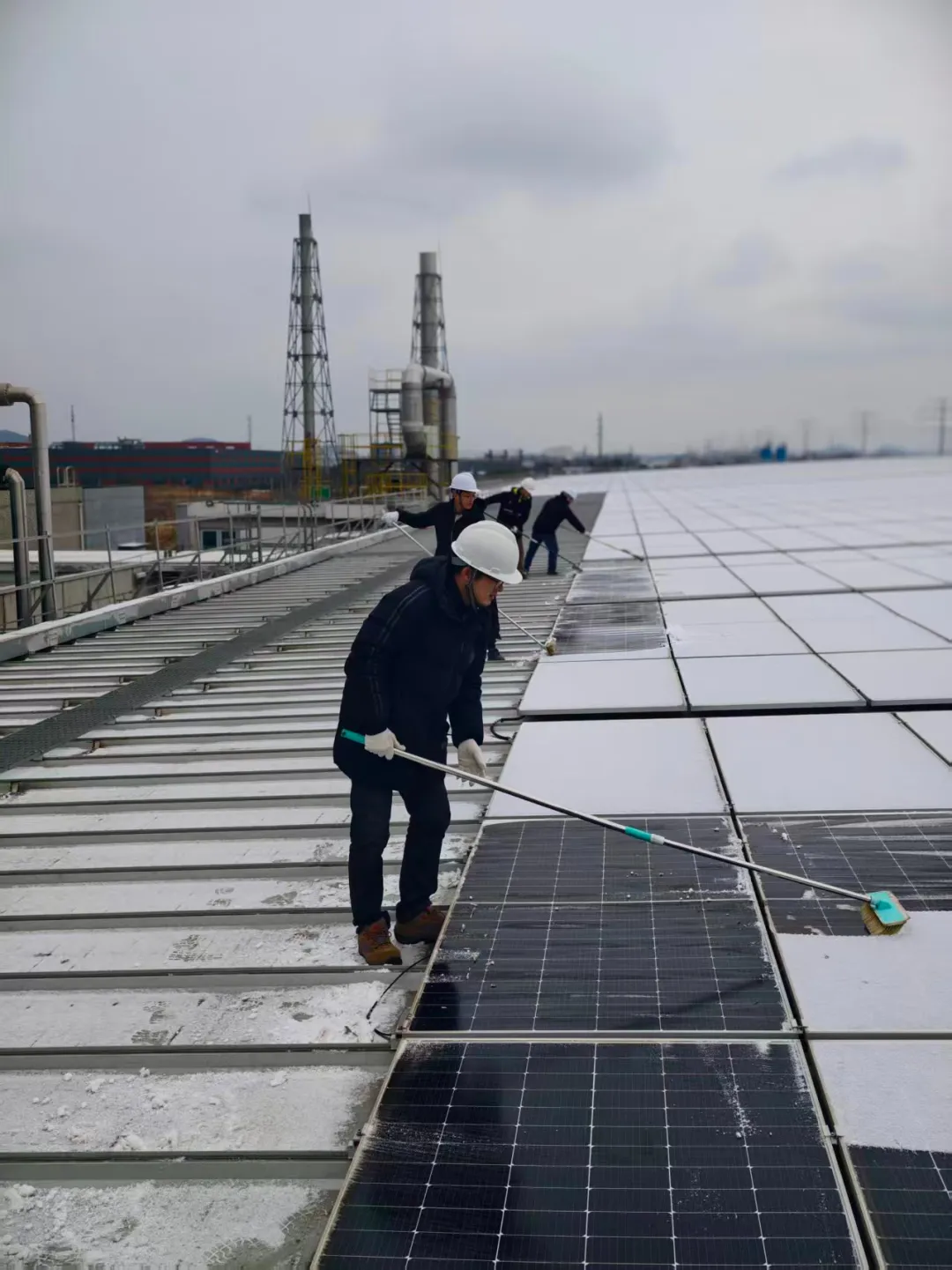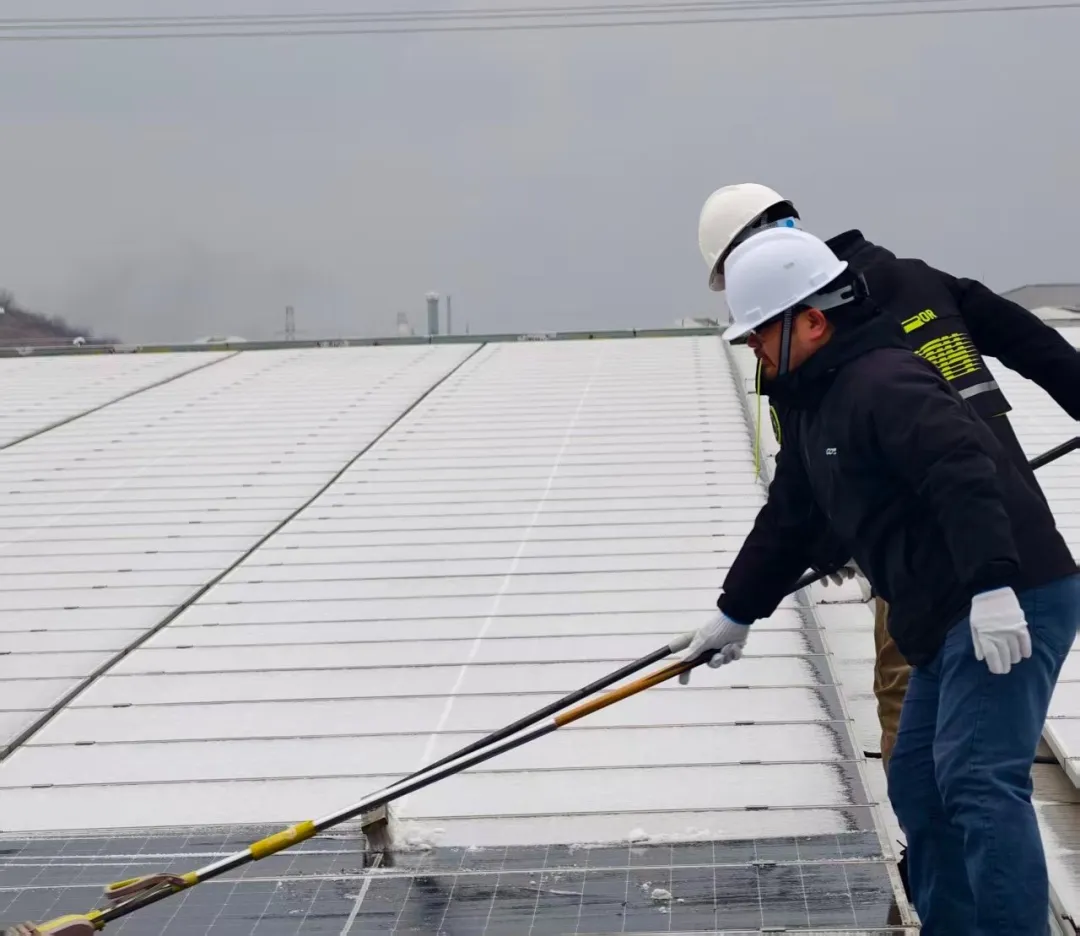 時(shí)值歲末年初,一輪強(qiáng)寒潮伴隨雨雪席卷多地,分布式光伏電站迎來嚴(yán)峻的冬季運(yùn)行考驗(yàn)。在此背景下,鎮(zhèn)江公司一支由電池中心、組件中心技術(shù)骨干組成的跨部門聯(lián)合運(yùn)維團(tuán)隊(duì),毅然頂風(fēng)冒雪,深入電站一線,以專業(yè)能力與高效協(xié)同,全面打響了一場保障設(shè)備安全、提升發(fā)電效能的冬季攻堅(jiān)戰(zhàn)。面對低溫雨雪導(dǎo)致電站出力周期性下降的實(shí)際情況,團(tuán)隊(duì)主動打破職能邊界,精準(zhǔn)整合優(yōu)勢技術(shù)力量,充分利用發(fā)電負(fù)荷較低的運(yùn)行“窗口期”,全面展開預(yù)防性維護(hù)與系統(tǒng)隱患排查,為2026年度發(fā)電目標(biāo)的達(dá)成夯實(shí)設(shè)備與管理基礎(chǔ)。 破冰除雪,守護(hù)發(fā)電“生命線” 降雪過后,光伏組件易被冰雪覆蓋,嚴(yán)重影響發(fā)電效率并帶來潛在安全風(fēng)險(xiǎn)。運(yùn)維人員身著全套防寒裝備,使用專業(yè)工具,對陣列進(jìn)行逐排精細(xì)化清雪除冰。寒風(fēng)凜冽,作業(yè)艱辛,他們堅(jiān)守的身影與冰封的光伏板共同構(gòu)成了冬日里一道堅(jiān)韌的風(fēng)景線。