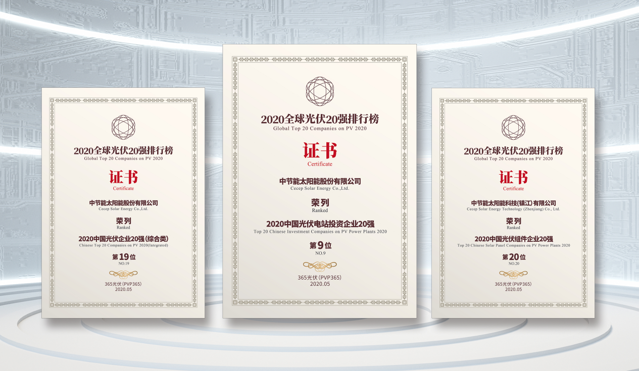 On May 10, 2020, the “Global Top 20 Companies on PV 2020” launched and sponsored by PVP365 was officially released in Beijing to the world. According to the results, CECEP Solar Energy Co., Ltd. was honored as the “Top 20 Chinese Investment Companies on PV Power Plants 2020” and the “Chinese Top 20 Companies on PV 2020 (Integrated)”, while CECEP Solar Energy Technology (Zhenjiang) Co., Ltd. was listed on the “Top 20 Chinese Solar Panel Companies on PV Power Plants 2020”.